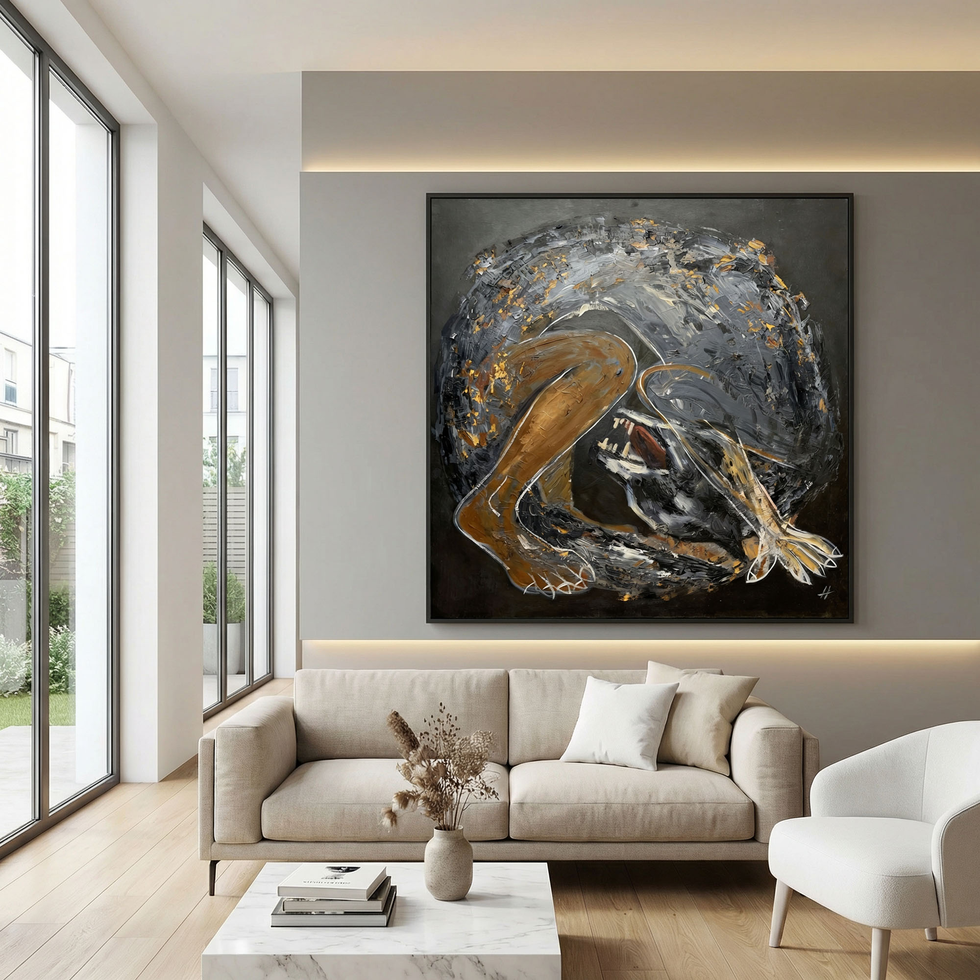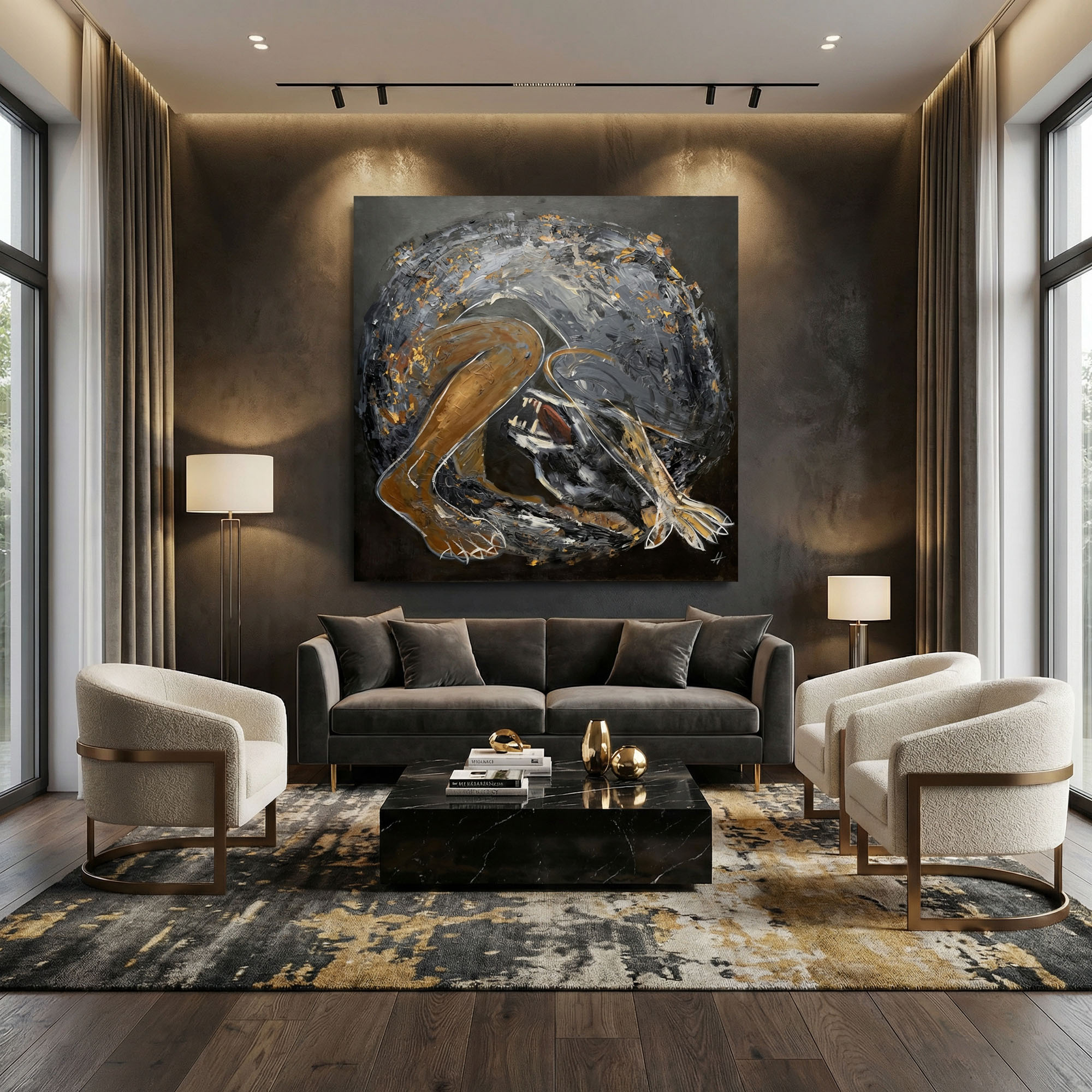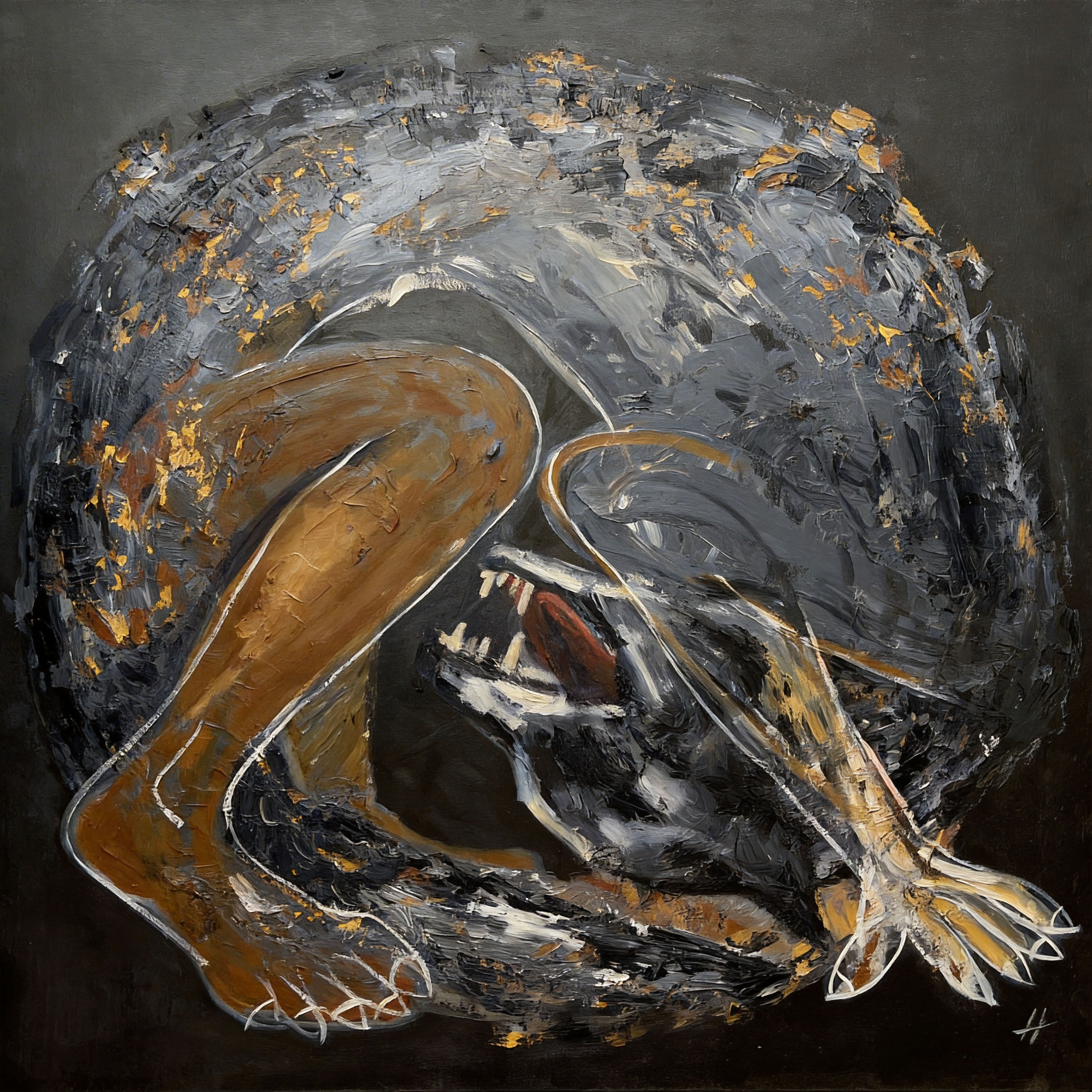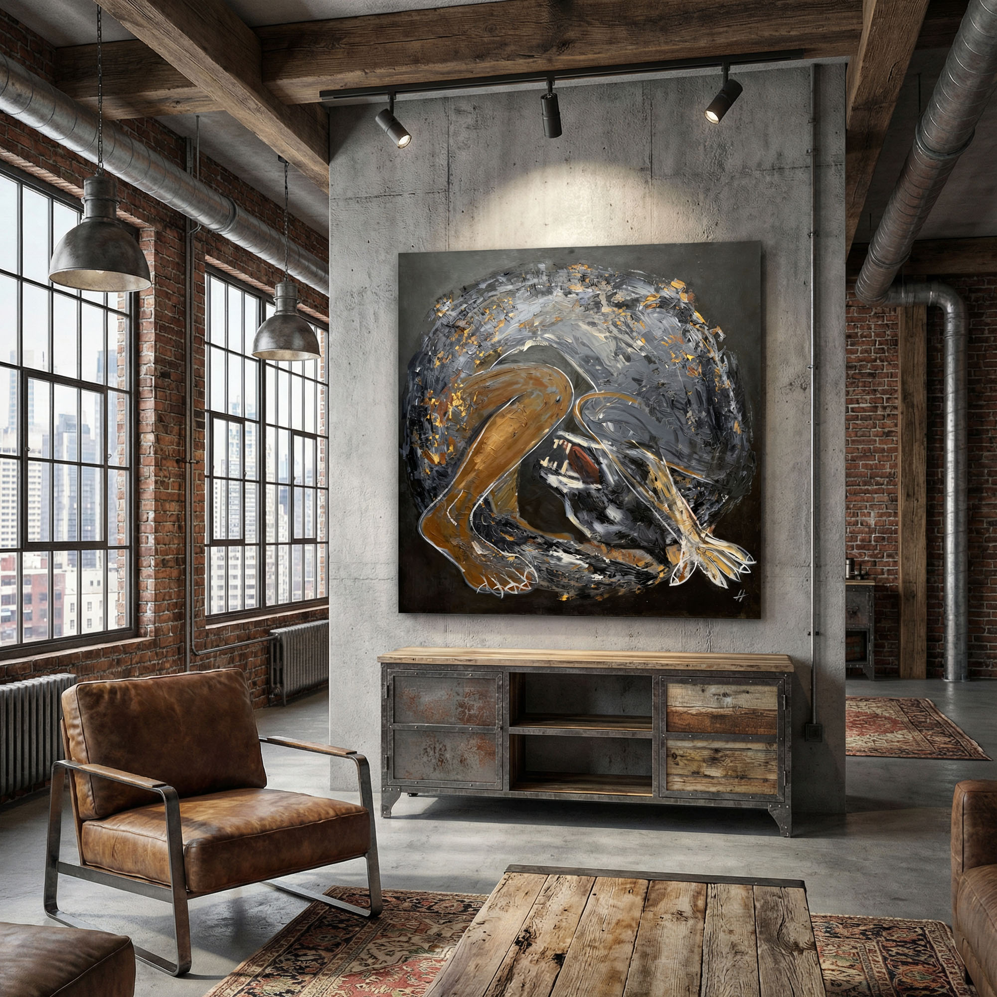 Boundary oil painting on canvas 100x100 cm exploring the invisible boundary between human and beast