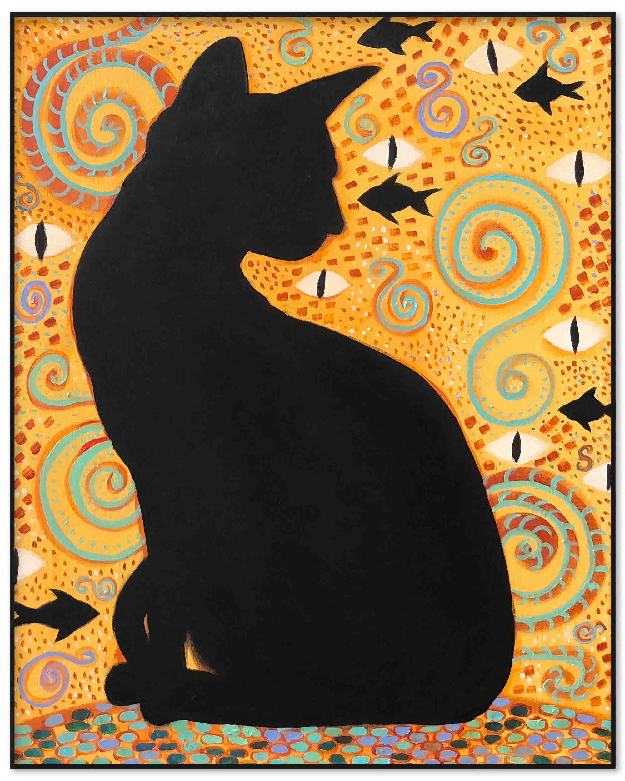 • Black cat oil painting depicting a mystical guardian cat in symbolic golden composition